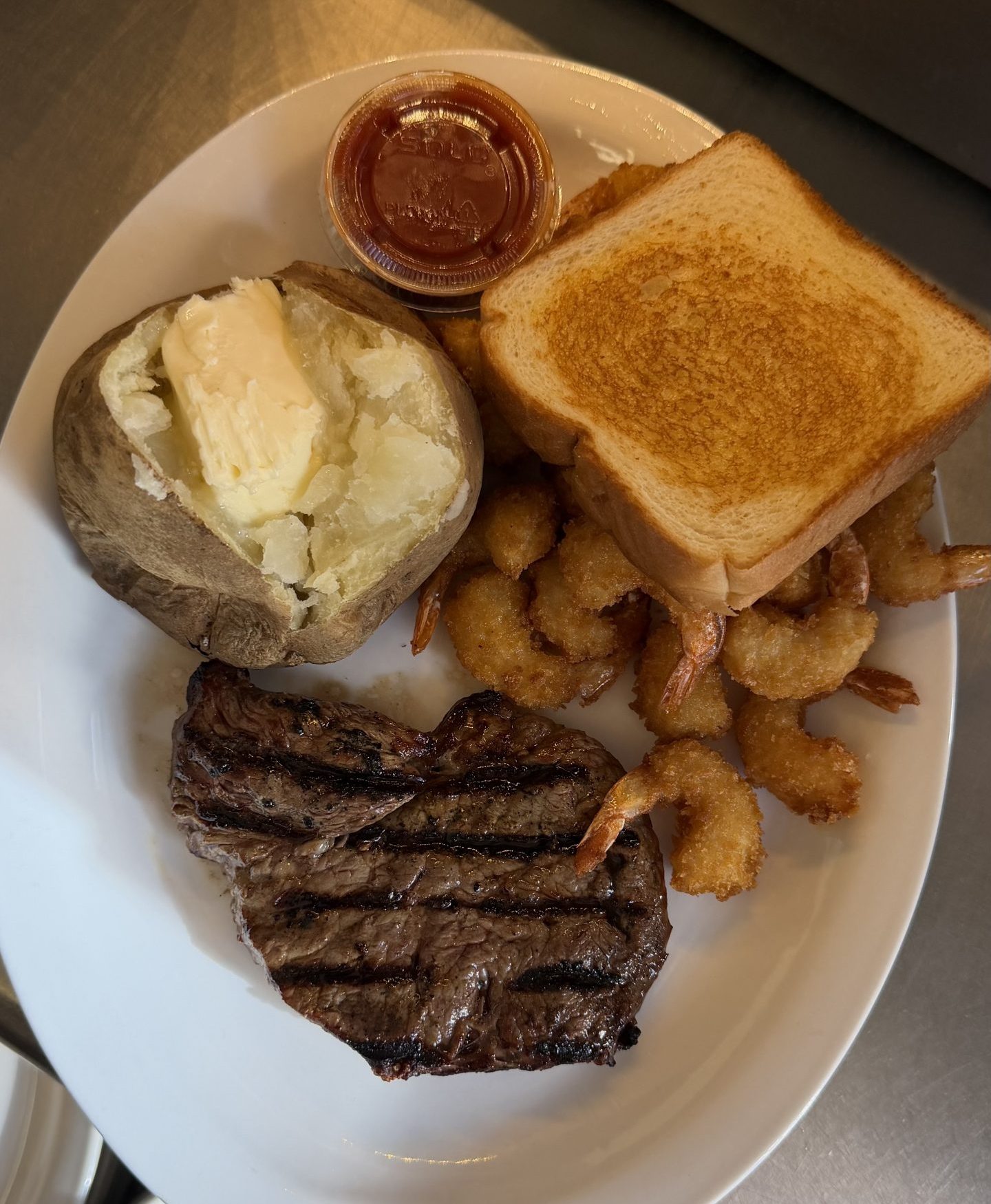 6 oz. Steak & Shrimp For a bit variety, you can try our surf and turf! This platter features 8 ounces of shrimp and 6 ounces of our choice sirloin beef. Served with your choice of steak fries or baked potato, salad & Texas toast. Post navigation Next post Country Fried Steak