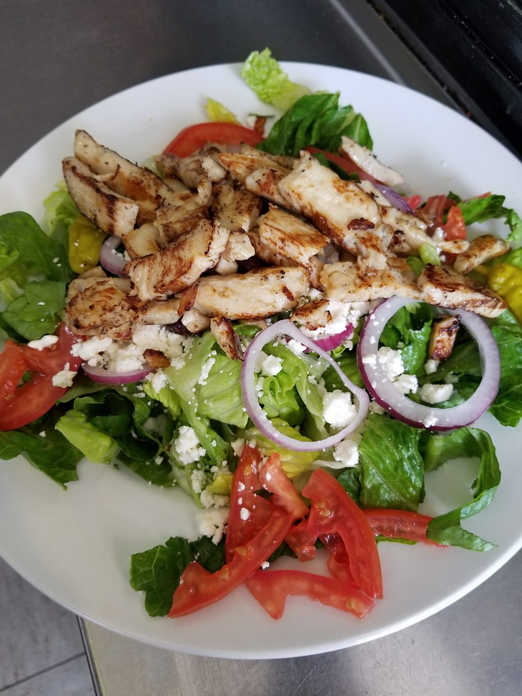 Chicken Greek Salad Just like our delicious Greek salad but topped with tender juicy strips of grilled chicken. Need just a little something more? Add Pita bread! Post navigation Previous post Gyros SaladNext post Greek Salad