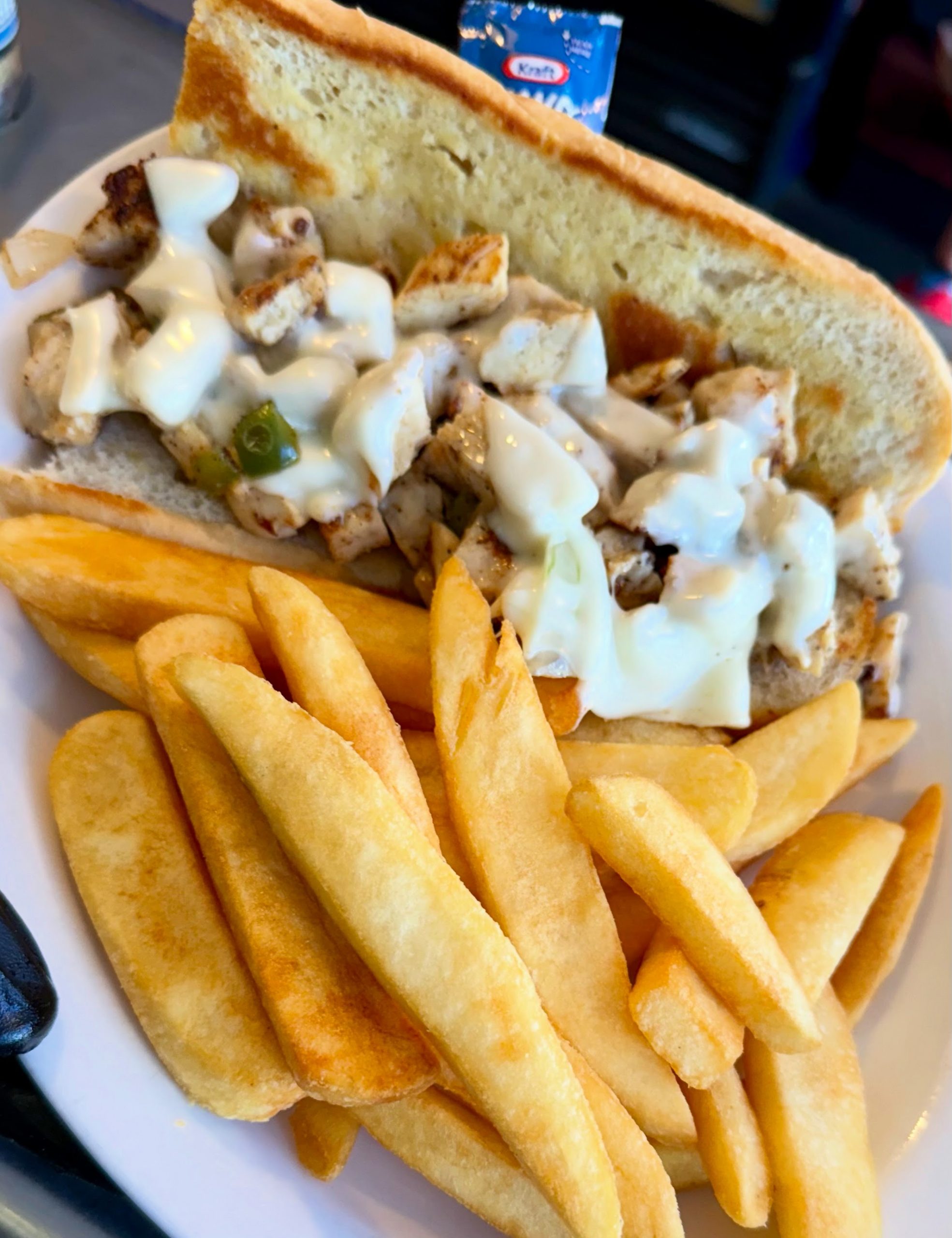 Chicken Philly (The Brookie) This sandwich features chunks of tender grilled chicken with sautéed onions and bell peppers and topped with Swiss cheese! Served with our delicious steak fries. Its a must try for any Philly cheesesteak fan! Post navigation Previous post Pork TenderloinNext post Grilled Chicken Sandwich