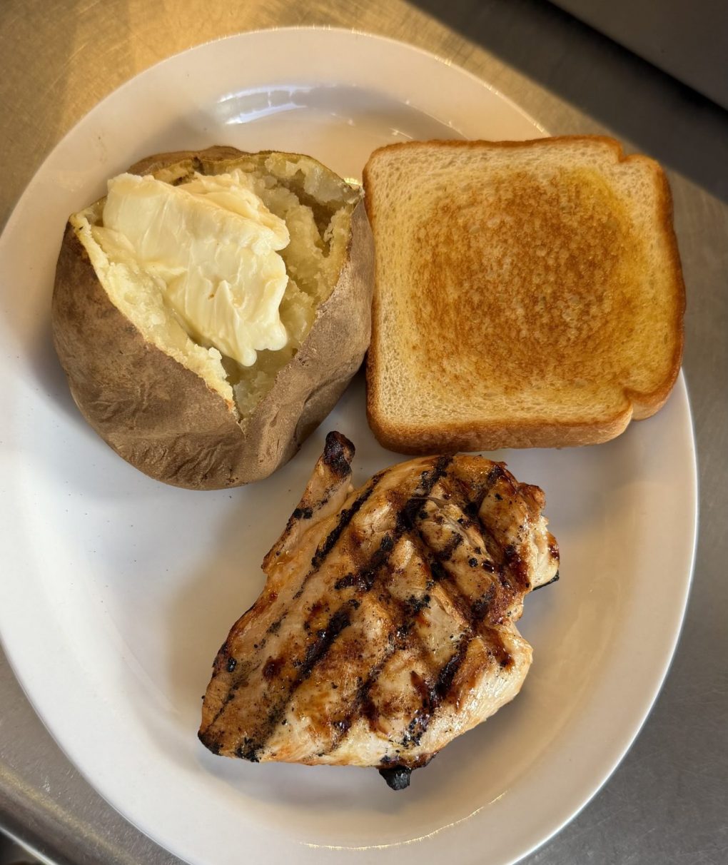 Grilled Chicken Dinner This 7 ounce skinless, boneless and tender chicken breast is char-broiled to perfection! It is served like a dinner with salad, Baked potato and toast. Post navigation Previous post Chicken Philly (The Brookie)Next post Gyros Salad