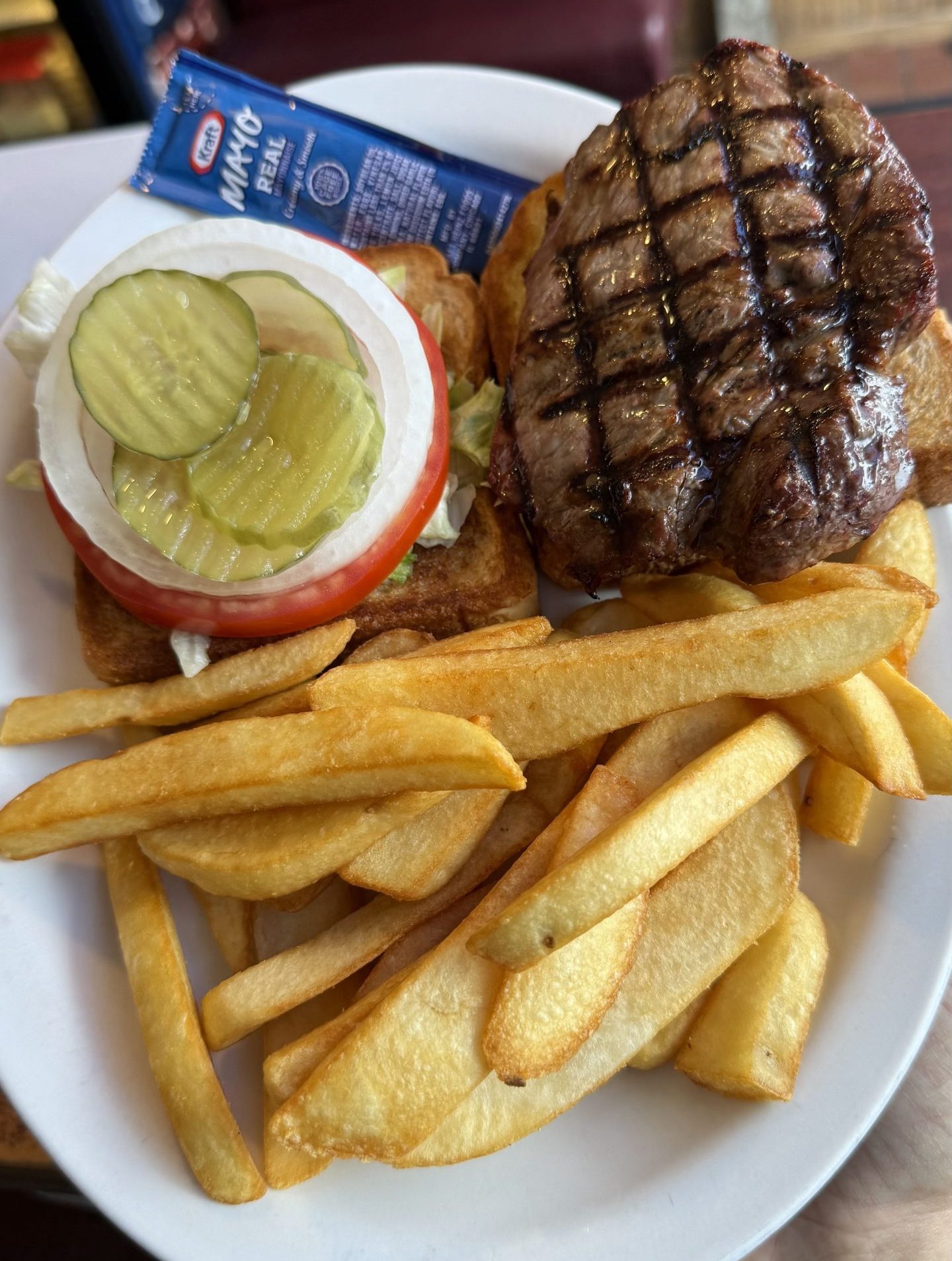 Steak Sandwich (Alexia’s Favorite) This hearty sandwich features our tender choice top sirloin between two thick slices of Texas Toast. Served with lettuce, tomatoes, onions and pickles. Served with our delicious steak fries. Post navigation Previous post Gyros SandwichNext post Chicken Nuggets (10 pc.)